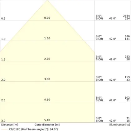 Beispiel: Wird eine Lampe mit einem Abstrahlwinkel von 60 Grad an der Decke (2,5 m Höhe) angebracht, erzeugt sie einen Lichtkegel von 2,9 Metern Durchmesser. Hat die Lampe hingegen einen Abstrahlwinkel von 120 Grad, beträgt der Lichtkegel 8,7 Meter im Durchmesser. |