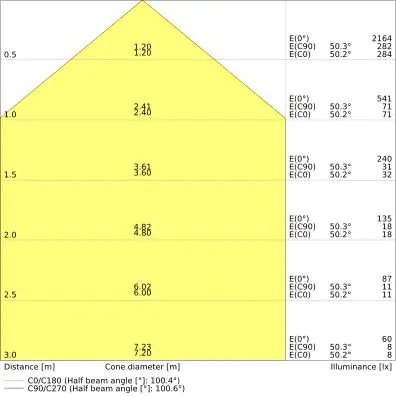 Beispiel: Wird eine Lampe mit einem Abstrahlwinkel von 60 Grad an der Decke (2,5 m Höhe) angebracht, erzeugt sie einen Lichtkegel von 2,9 Metern Durchmesser. Hat die Lampe hingegen einen Abstrahlwinkel von 120 Grad, beträgt der Lichtkegel 8,7 Meter im Durchmesser. |
