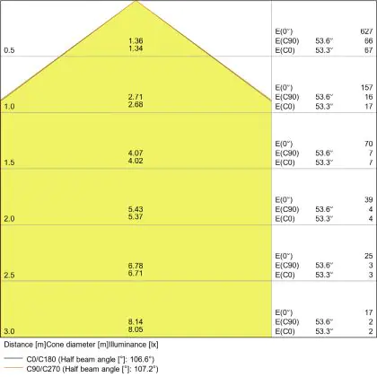Beispiel: Wird eine Lampe mit einem Abstrahlwinkel von 60 Grad an der Decke (2,5 m Höhe) angebracht, erzeugt sie einen Lichtkegel von 2,9 Metern Durchmesser. Hat die Lampe hingegen einen Abstrahlwinkel von 120 Grad, beträgt der Lichtkegel 8,7 Meter im Durchmesser. |