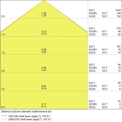 Beispiel: Wird eine Lampe mit einem Abstrahlwinkel von 60 Grad an der Decke (2,5 m Höhe) angebracht, erzeugt sie einen Lichtkegel von 2,9 Metern Durchmesser. Hat die Lampe hingegen einen Abstrahlwinkel von 120 Grad, beträgt der Lichtkegel 8,7 Meter im Durchmesser. |