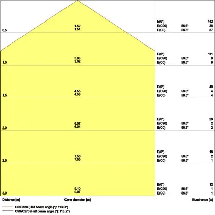 Beispiel: Wird eine Lampe mit einem Abstrahlwinkel von 60 Grad an der Decke (2,5 m Höhe) angebracht, erzeugt sie einen Lichtkegel von 2,9 Metern Durchmesser. Hat die Lampe hingegen einen Abstrahlwinkel von 120 Grad, beträgt der Lichtkegel 8,7 Meter im Durchmesser. |