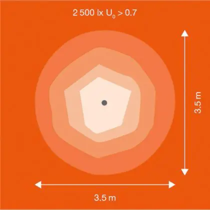 Beispiel: Wird eine Lampe mit einem Abstrahlwinkel von 60 Grad an der Decke (2,5 m Höhe) angebracht, erzeugt sie einen Lichtkegel von 2,9 Metern Durchmesser. Hat die Lampe hingegen einen Abstrahlwinkel von 120 Grad, beträgt der Lichtkegel 8,7 Meter im Durchmesser. |