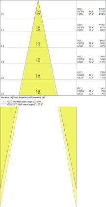 Beispiel: Wird eine Lampe mit einem Abstrahlwinkel von 60 Grad an der Decke (2,5 m Höhe) angebracht, erzeugt sie einen Lichtkegel von 2,9 Metern Durchmesser. Hat die Lampe hingegen einen Abstrahlwinkel von 120 Grad, beträgt der Lichtkegel 8,7 Meter im Durchmesser. |