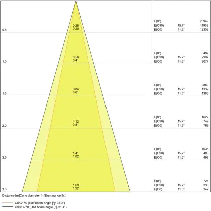 Beispiel: Wird eine Lampe mit einem Abstrahlwinkel von 60 Grad an der Decke (2,5 m Höhe) angebracht, erzeugt sie einen Lichtkegel von 2,9 Metern Durchmesser. Hat die Lampe hingegen einen Abstrahlwinkel von 120 Grad, beträgt der Lichtkegel 8,7 Meter im Durchmesser. |