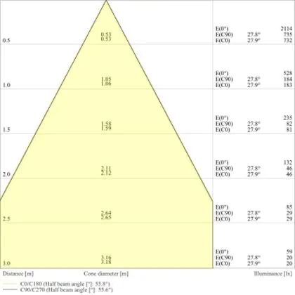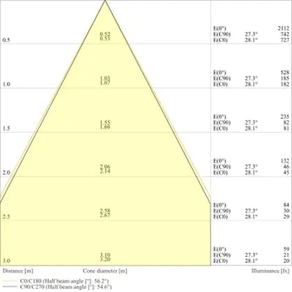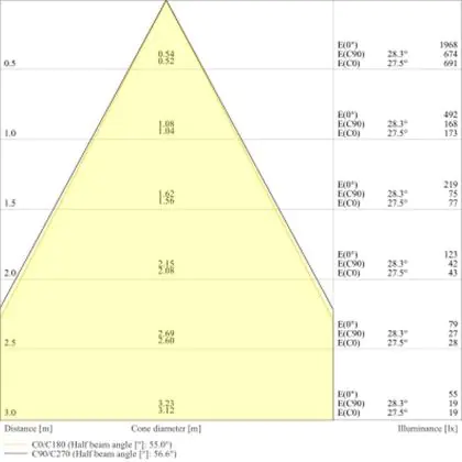Beispiel: Wird eine Lampe mit einem Abstrahlwinkel von 60 Grad an der Decke (2,5 m Höhe) angebracht, erzeugt sie einen Lichtkegel von 2,9 Metern Durchmesser. Hat die Lampe hingegen einen Abstrahlwinkel von 120 Grad, beträgt der Lichtkegel 8,7 Meter im Durchmesser. |