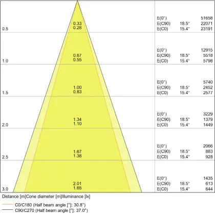 Beispiel: Wird eine Lampe mit einem Abstrahlwinkel von 60 Grad an der Decke (2,5 m Höhe) angebracht, erzeugt sie einen Lichtkegel von 2,9 Metern Durchmesser. Hat die Lampe hingegen einen Abstrahlwinkel von 120 Grad, beträgt der Lichtkegel 8,7 Meter im Durchmesser. |
