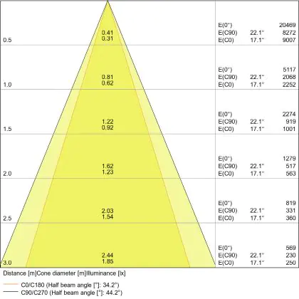 Beispiel: Wird eine Lampe mit einem Abstrahlwinkel von 60 Grad an der Decke (2,5 m Höhe) angebracht, erzeugt sie einen Lichtkegel von 2,9 Metern Durchmesser. Hat die Lampe hingegen einen Abstrahlwinkel von 120 Grad, beträgt der Lichtkegel 8,7 Meter im Durchmesser. |