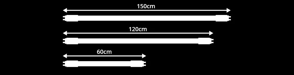 Die meisten T8 LED-Röhren kommen in den Längen 60 cm, 90 cm, 120 cm sowie 150 cm vor.