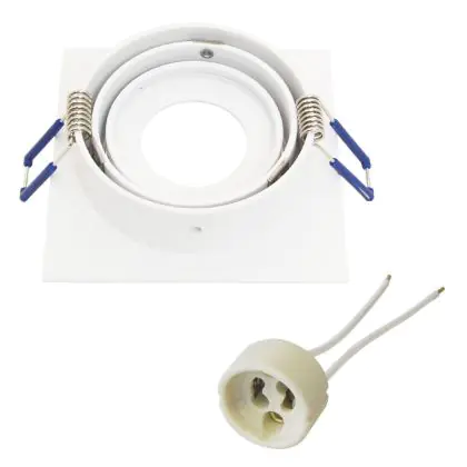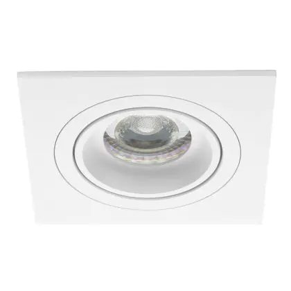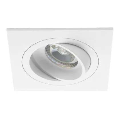 Das rechteckige Aluminiumgehäuse ist jeweils 92 mm lang und breit und ist in einem zeitlosen Weiß gehalten. Es hat einen Ausschnitt mit einem Durchmesser von 80 mm, in den das GU10-Leuchtmittel eingesetzt wird. Die Fassung verfügt über eine Installationstiefe von 75 mm und kann um bis zu 40° geschwenkt werden.