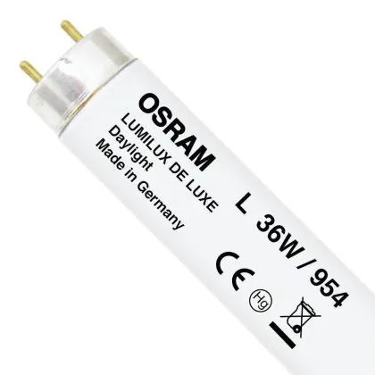 Die Osram Lumilux De Luxe T8 36W - 954 Kaltweiß | 120cm ist eine T8 Leuchtstoffröhre von Osram mit einer Länge von 1200 mm. Das Produkt verfügt über 2 Pins und hat einen Durchmesser von 26 mm. Die Röhre strahlt Licht in der Farbtemperatur 5400K - Kaltweiß aus und punktet durch eine lange Lebensdauer.