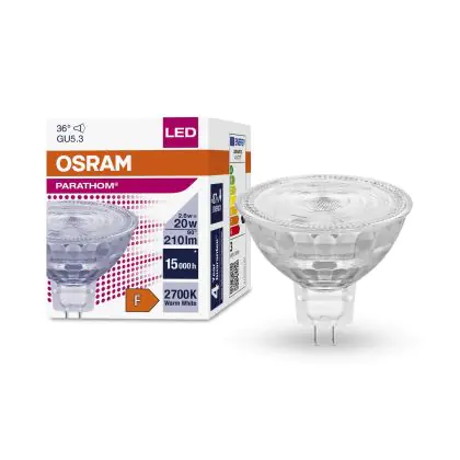 Die Osram Parathom LED-Spot GU5.3 MR16 2.6W 230lm 36D - 827 Extra Warmweiß | Ersatz für 20W ist eine effiziente GU5.3 LED-Lampe und der perfekte Ersatz für Ihre konventionelle Halogenlampe mit 20W und einem GU5.3-Sockel, bei dem die beiden Stifte einen Abstand von 5,3 mm zueinander haben. Die Abkürzung MR16 zeigt Ihnen, dass der Reflektor einen Durchmesser von 5 cm hat. Zudem strahlt das Produkt Licht in der Farbtemperatur 2700K - Extra Warmweiß aus und punktet durch eine lange Lebensdauer.