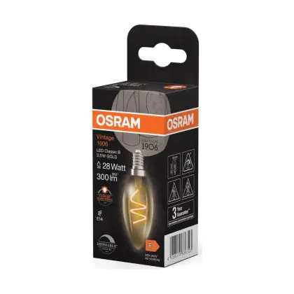 Die Osram Vintage 1906 LED Classic Slim E14 Kerze Fadenlampe Gold 3.5W 300lm - 922 Extra Warmweiß | Höchste Farbwiedergabe - Dimmbar - Ersatz Für 25W ist eine effiziente E14 LED-Lampe mit Retrodesign und der perfekte Ersatz für Ihre konventionellen 25W Lampen mit E14. Zudem strahlt sie Licht in der Farbtemperatur 2200K - Extra Warmweiß aus und punktet durch eine lange Lebensdauer.