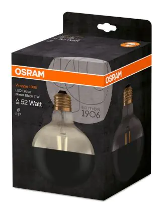 Die Osram Vintage 1906 LED E27 Globe 7W 827 Spiegel Schwarz | Ersetzt 52W ist eine moderne LED-Lampe mit Vintage-Design. Sie kann ganz einfach herkömmliche Leuchten mit einem E27-Sockel, sowie einem Verbrauch von 52 Watt ersetzen und ermöglicht damit eine Energieersparnis von bis zu 90 %. Zudem punktet die Lampe mit einer langen Lebensdauer, leuchtet in der Farbtemperatur extra Warmweiß und besitzt einen spiegelschwarzen Leuchtkörper, dessen untere Hälfte klar und die obere Hälfte schwarz ist.