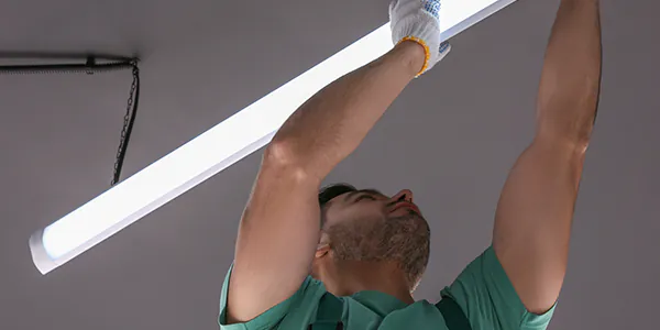 Bildquellen: Mann installiert LED-Panel (AdobeStock/Andrey Popov), Elektriker installiert eine Leuchte (AdobeStock/New Africa)